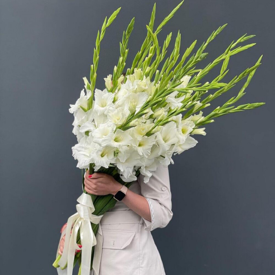 На фото букет из 19 белых гладиолусов. В составе: гладиолус 19 шт, атласная лента 1 шт, . Все цветы свежие и ароматные, букет красиво оформлен и отлично подходит для подарка. Доступна доставка цветов или самовывоз.