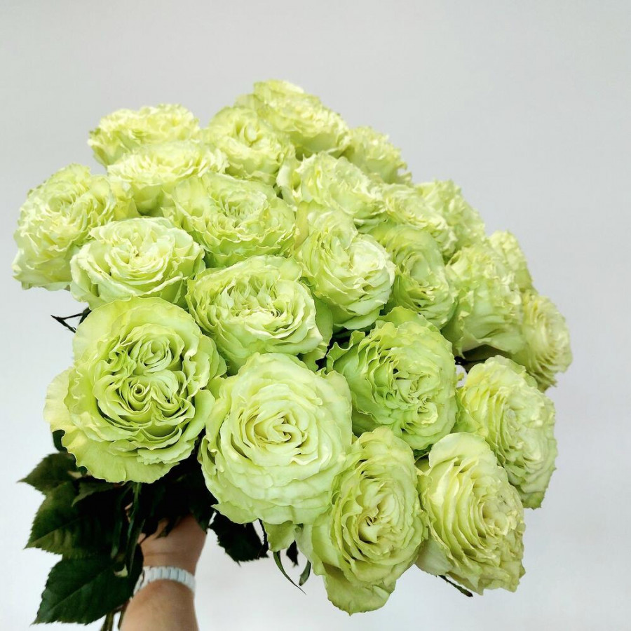 На фото букет из 21 зеленой розы. В составе: пионовидная роза 21 шт, атласная лента 1 шт, . Все цветы свежие и ароматные, букет красиво оформлен и отлично подходит для подарка. Доступна доставка цветов или самовывоз.