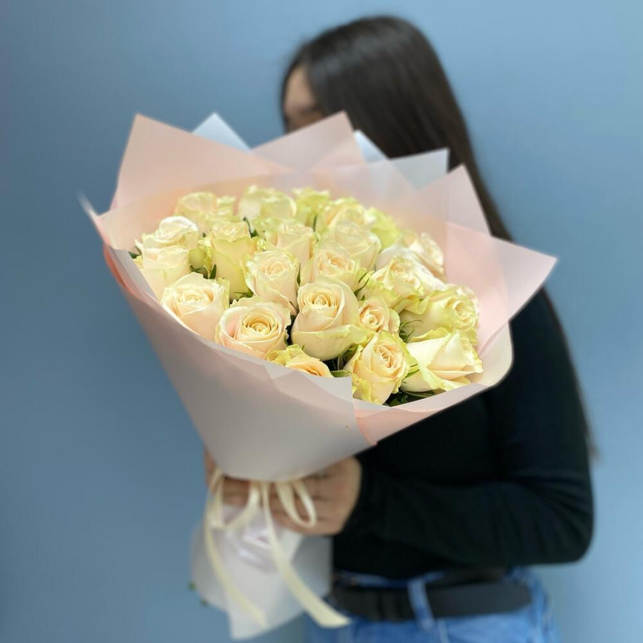 На фото букет из 25 кремовых роз. В составе: роза 25 шт, дизайнерская упаковка 2 шт, атласная лента 2 шт, . Все цветы свежие и ароматные, букет красиво оформлен и отлично подходит для подарка. Доступна доставка цветов или самовывоз.