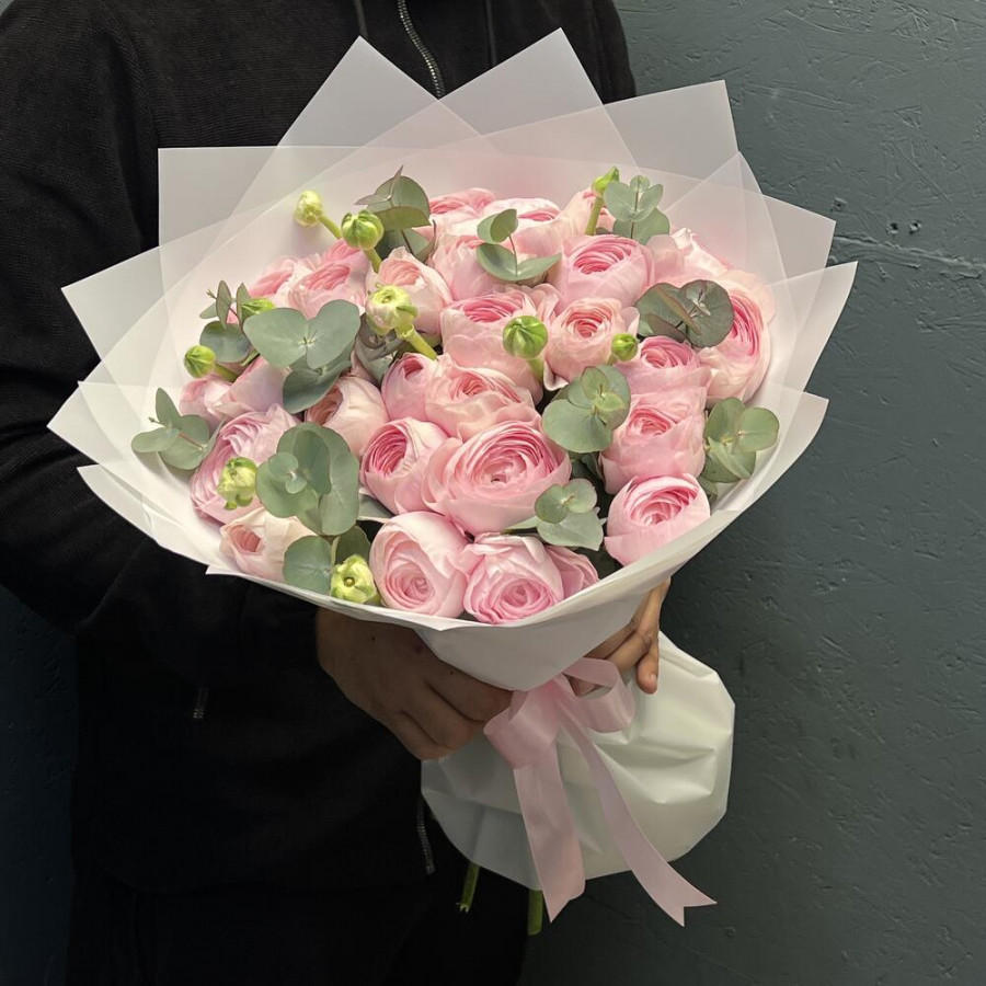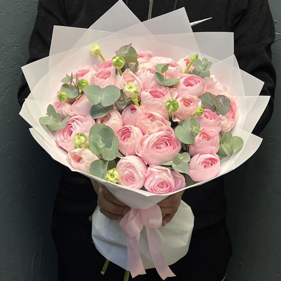 Букет из 29 розовых ранункулюсов с эвкалиптом в Сургуте