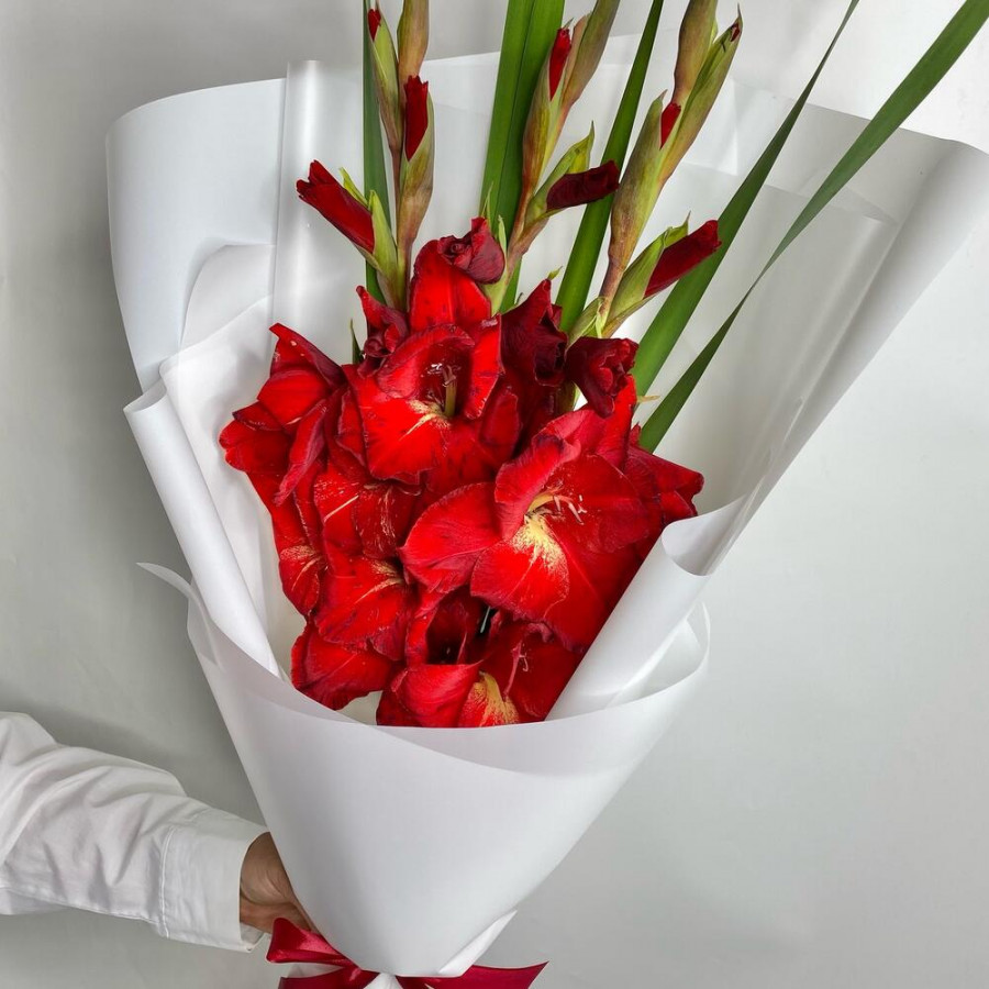 На фото букет из 3 красных гладиолусов. В составе: гладиолус 3 шт, дизайнерская упаковка 2 шт, атласная лента 2 шт, . Все цветы свежие и ароматные, букет красиво оформлен и отлично подходит для подарка. Доступна доставка цветов или самовывоз.