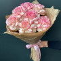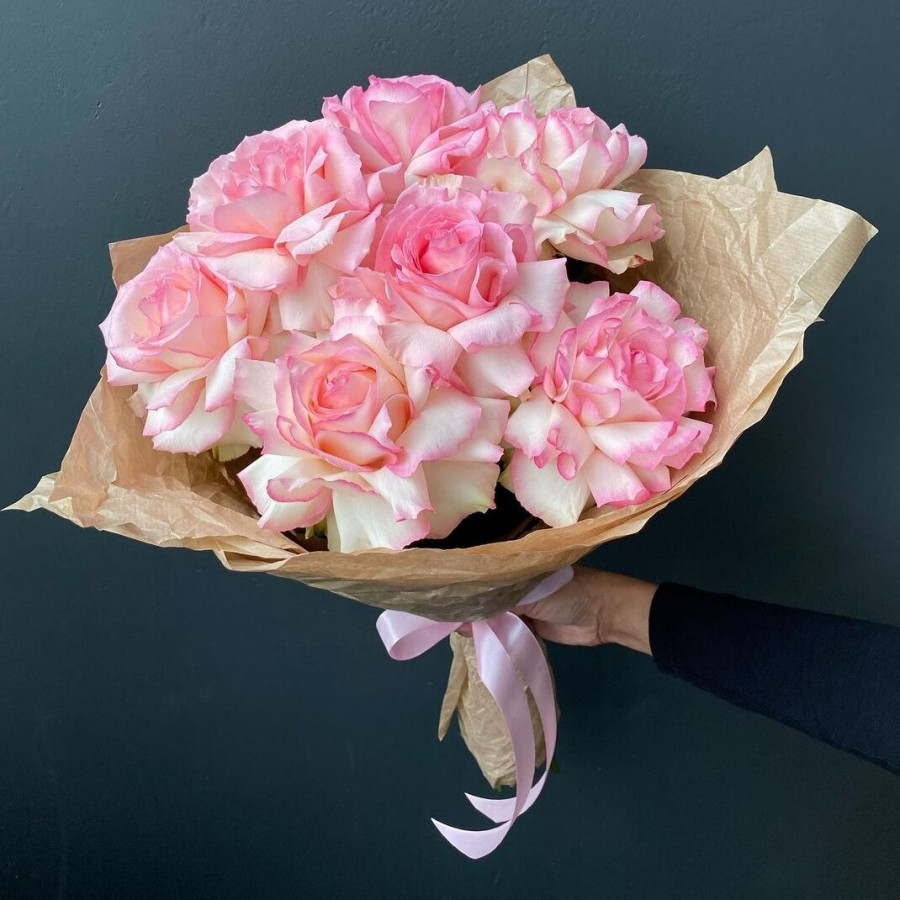 На фото букет из 7 розовых ажурных роз. В составе: роза 7 шт, крафт-бумага 1 шт, атласная лента 1 шт, . Все цветы свежие и ароматные, букет красиво оформлен и отлично подходит для подарка. Доступна доставка цветов или самовывоз.