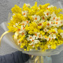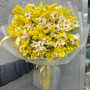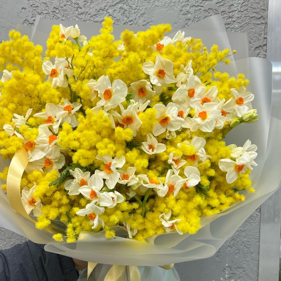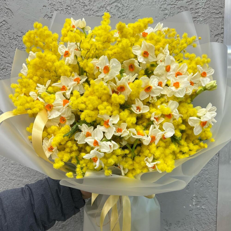 На фото букет из нарциссов и мимозы. В составе: нарцисс 40 шт, мимоза 2 шт, дизайнерская упаковка 1 шт, атласная лента 1 шт, . Все цветы свежие и ароматные, букет красиво оформлен и отлично подходит для подарка. Доступна доставка цветов или самовывоз.