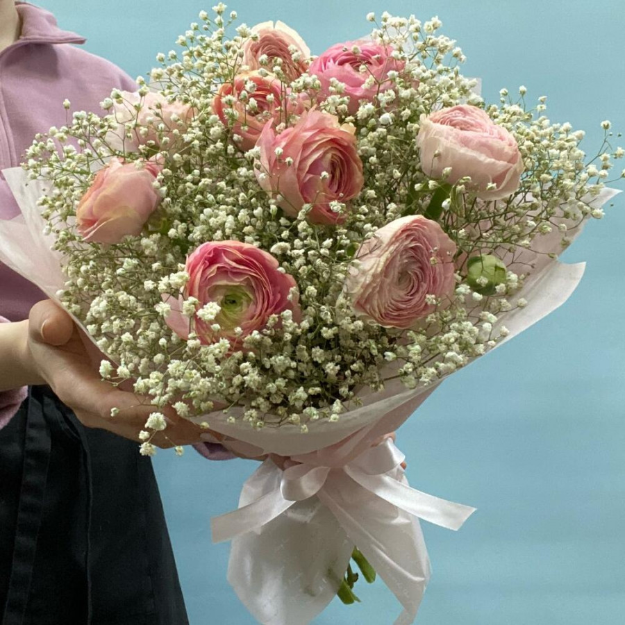 Букет из розовых ранункулюсов с белой гипсофилой в Сургуте