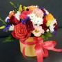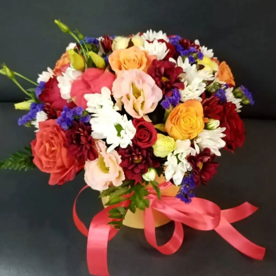 На фото розы, хризантемы и статица в шляпной коробке. В составе: роза 7 шт, роза (кения) 11 шт, хризантема кустовая 5 шт, эустома (лизиантус) 3 шт, статица 5 шт, коробка (s) 1 шт, . Все цветы свежие и ароматные, букет красиво оформлен и отлично подходит для подарка. Доступна доставка цветов или самовывоз.